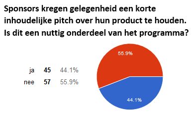 Was er dan helemaal niets aan te merken? De door ons geprogrammeerde (maar inhoudelijk buiten onze verantwoordelijkheid vallende) sponsorpitches werden door een meerderheid van de deelnemers niet erg nuttig gevonden.