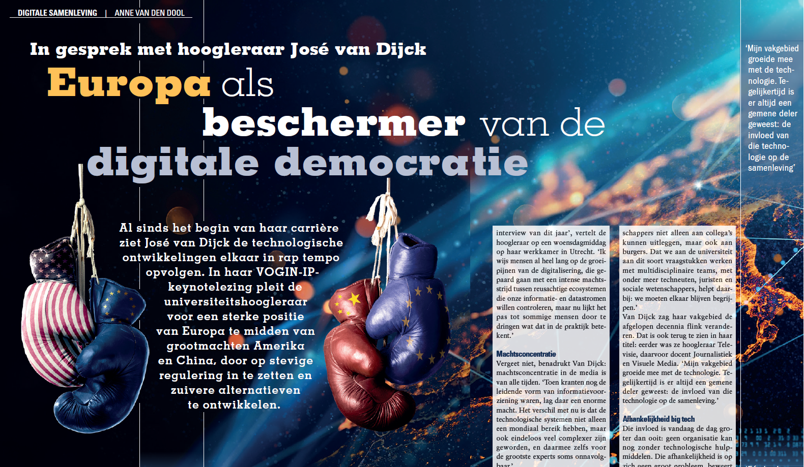 Al sinds het begin van haar carrière ziet José van Dijck de technologische ontwikkelingen elkaar in rap tempo opvolgen. In haar VOGIN-IP keynotelezing pleit de universiteitshoogleraar voor een sterke positie van Europa te midden van grootmachten Amerika en China, door op stevige regulering in te zetten en zuivere alternatieven te ontwikkelen.