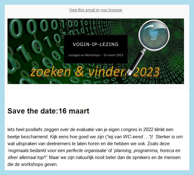 Na de eerste nieuwsbrief stromen de inschrijvingen binnen, hoewel dit jaar iets langzamer dan anders. Postcorona verschijnsel misschien. Dan is het even rustig en na de tweede nieuwsbrief trekt het weer aan. Hier past misschien meer bescheidenheid. Het kan toch niet alleen maar liggen aan onze nieuwsbrieven, tweets etc.? De steun van andere kanalen zoals IP zal ook zeker helpen. Bij iedere uiting kunnen we meer exacte informatie kwijt en blijven inschrijvers zich melden.