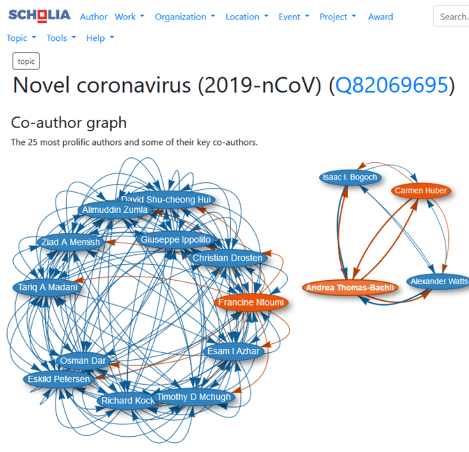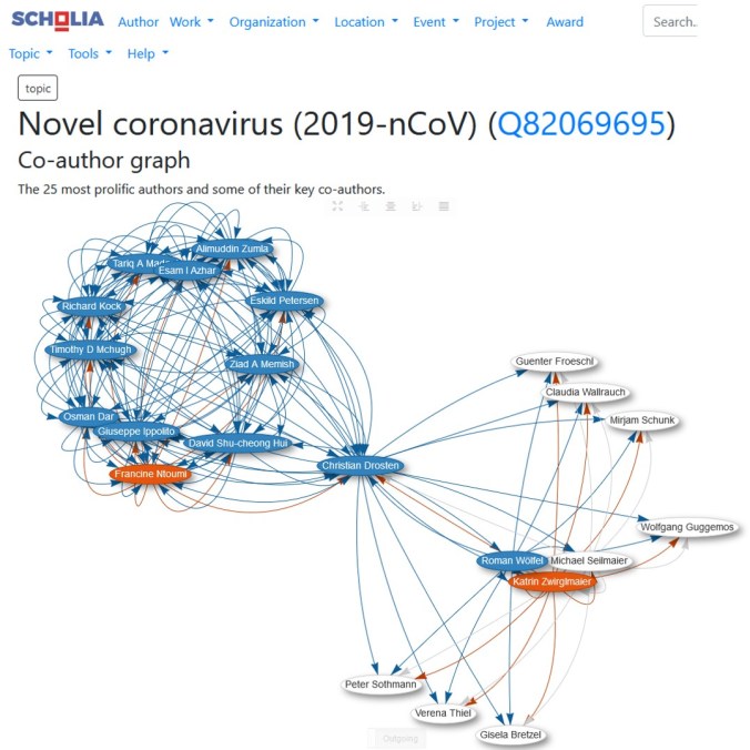 Als eye-catcher stond boven onze vorige blogpost een weergave van de relaties tussen auteurs/publicaties over het nieuwe Corona-virus, zoals dat met de Scholia-applicatie uit Wikidata-gegevens gegenereerd was. Nog maar vijf dagen later zag het beeld van dit hot topic er al weer heel anders uit, zoals je hierboven ziet. Wie wil weten hoe deze crisis zich verder ontwikkelt, voorzover dat zijn weerslag vindt in de wetenschappelijke literatuur, hoeft nu alleen maar op dit plaatje te klikken. Dat activeert de link voor een verse Scholia-actie voor dit onderwerp. Daarvoor hoef je dus niet eens deel te nemen aan de workshop van Egon Willighagen. Al is het natuurlijk veel leuker om dat wel te doen, want dan zul je zien dat er met Wikidata, Wikicite en Scholia nog veel meer kan dan deze “virus-scan”. </einde STER-spot>