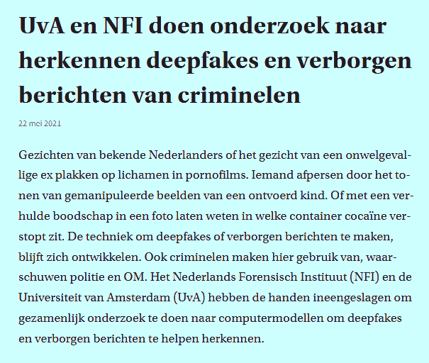 Dit onderzoek berust voor een belangrijk deel op kunstmatige intelligentie en wordt dan ook uitgevoerd bij het Innovation Center for Artificial Intelligence, een nationaal netwerk waarin universiteiten, bedrijven en overheid samenwerken. Volgens Zeno Geradts zijn de huidige modellen voor het herkennen van deepfakes in staat om dat in zo’n 80% van de gevallen correct te doen, maar hij wil graag dat toch wel meer dan 99% eruit gevist kan worden. Er is dus nog genoeg werk te doen, des te meer omdat het een kat-en-muis spel is waarin snelle verbeteringen aan de maakkant moeten worden bijgehouden aan de detectiekant. Marcel Worring, de UvA-collega waarmee Zeno Geradts in dit project samenwerkt, memoreerde al dat van alle investeringen in deepfakes 90 procent gaat naar het verbeteren van de techniek om ze te maken en op dit moment maar 10 procent naar onderzoek om ze te herkennen.